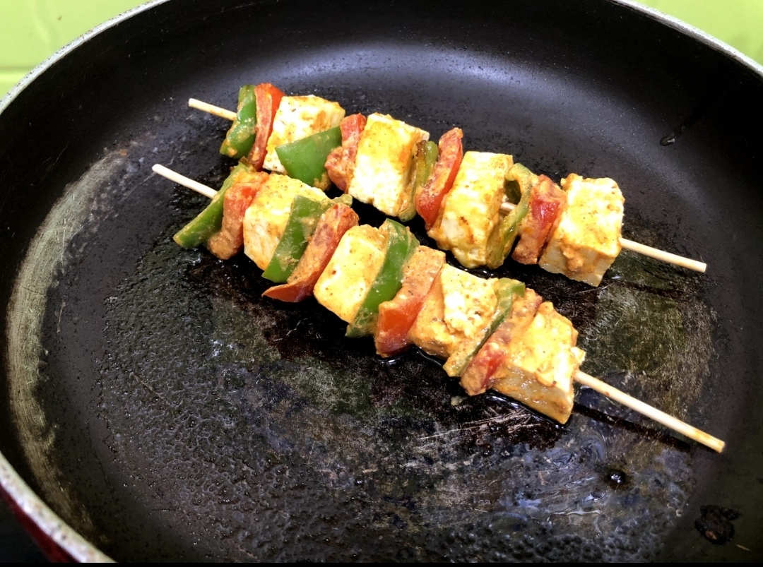 6. Now, grease the pan with oil and place the paneer stick on it . Cook this from both the sides . You can even bake this at 180℃ for 20 mins . You can use the same stick and arrange all of them again .