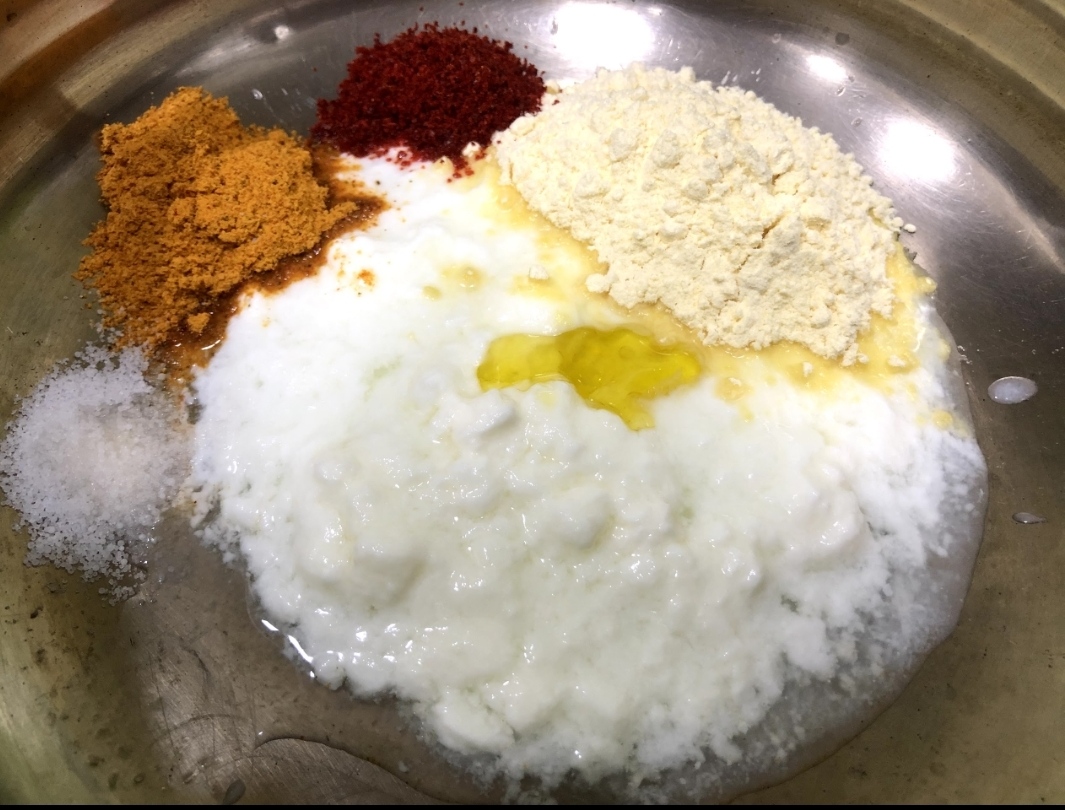 1. In a mixing bowl , add hung curd and gram flour (besan) . Give it a good mix and ensure that it’s lump – free .